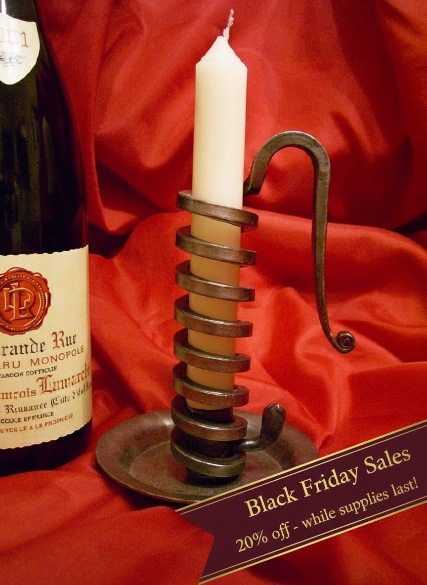 This item is very well designed: thanks to its stable flat bottom, it can be readily and safely set upright on any surface. Its handle (the rat’s tail) provides an easy and reliable grip and the hook can be used to hang the stand on a nail in the wall or on the edge of the oak casks in wine cellars. The spiral ramp allows you to control the height of the flame as the candle burns down by simply pushing the small tongue upward or downward, so you can use the candle completely. This candlestick holder is completely hand made, historic, useful and a beautiful decorative piece. The candles included with the stands are made from natural wax and paraffin. They do not smoke or run and last approximately 7 hours.